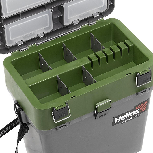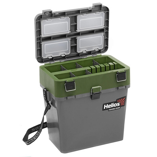 Ящик зимний рыболовный торговой марки Helios, изготовленный из ударопрочного, морозостойкого и в то же время легкого пластика, обеспечивает надежное хранение и транспортировку рыболовных снастей. Благодаря объему 19 литров, ящик вместит очень много полезных снастей для рыбалки. Основной отсек предназначен для переноски рыболовных снастей, термоса, так же удобен для перевозки улова. На внутренней стороне крышки размещены 4 отделения с полупрозразчными крышечками для хранения мелких аксессуаров. Удобный отсек со съемными перегородками позволяет разместить зимние удочки. Надежные и прочные замки не позволят изделию самопроизвольно открыться, а удобный наплечный ремень поможет комфортно его транспортировать. Пластиковый каркас выдерживает низкие температуры до -40˚С, не пропускает и не впитывает воду. Мягкое незамерзающее сиденье на крышке ящика, аккумулирующее тепло, позволит рыболову комфортно рыбачить с ящика долгое время. На дне ящика расположены специальные насечки против скольжения по льду. Летом подобный ящик несомненно пригодится для береговой рыбалки, когда необходимо иметь все снасти под рукой. Характеристики: Нагрузка: 130 кг. По проведенным тестированиям максимальная нагрузка ящика - 210 кг. Объем: 19 л. Длина: 39 см (по верху), 32 см - по низу. Ширина: 26 см Высота: 40 см Вес ящика: 2 кг. Цвет: серый/хаки.