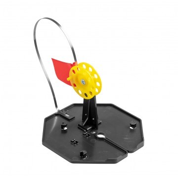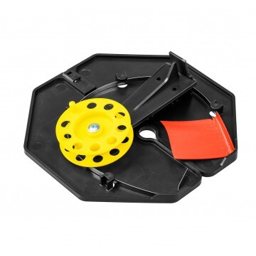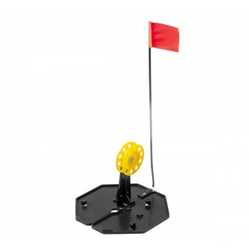 Жерлица зимняя для подледной ловли рыбы состоит из основания, стойки с катушкой и флажка-сигнализатора. Большое и прочное основание жерлицы из морозостойкого полипропилена гарантирует затемнение и защиту лунки от замерзания. Основание выполнено в виде восьмиугольника, что предотвращает проворачивание жерлицы в снегу. На основании находятся: прорезь для завода лески, паз под крепление стойки с катушкой, паз под крепление сигнализатора — флага.